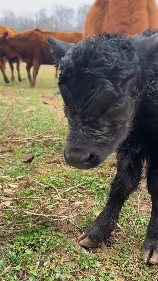 Snickers is a burly, long legged, wide-eyed, dark red bull with the same “highlights” as his mama Jonquil. He is horned. He may carry dun. Snickers is maturing quickly. He has masculine forehead curls and a thick curly winter coat. He would make a fine herd sire.