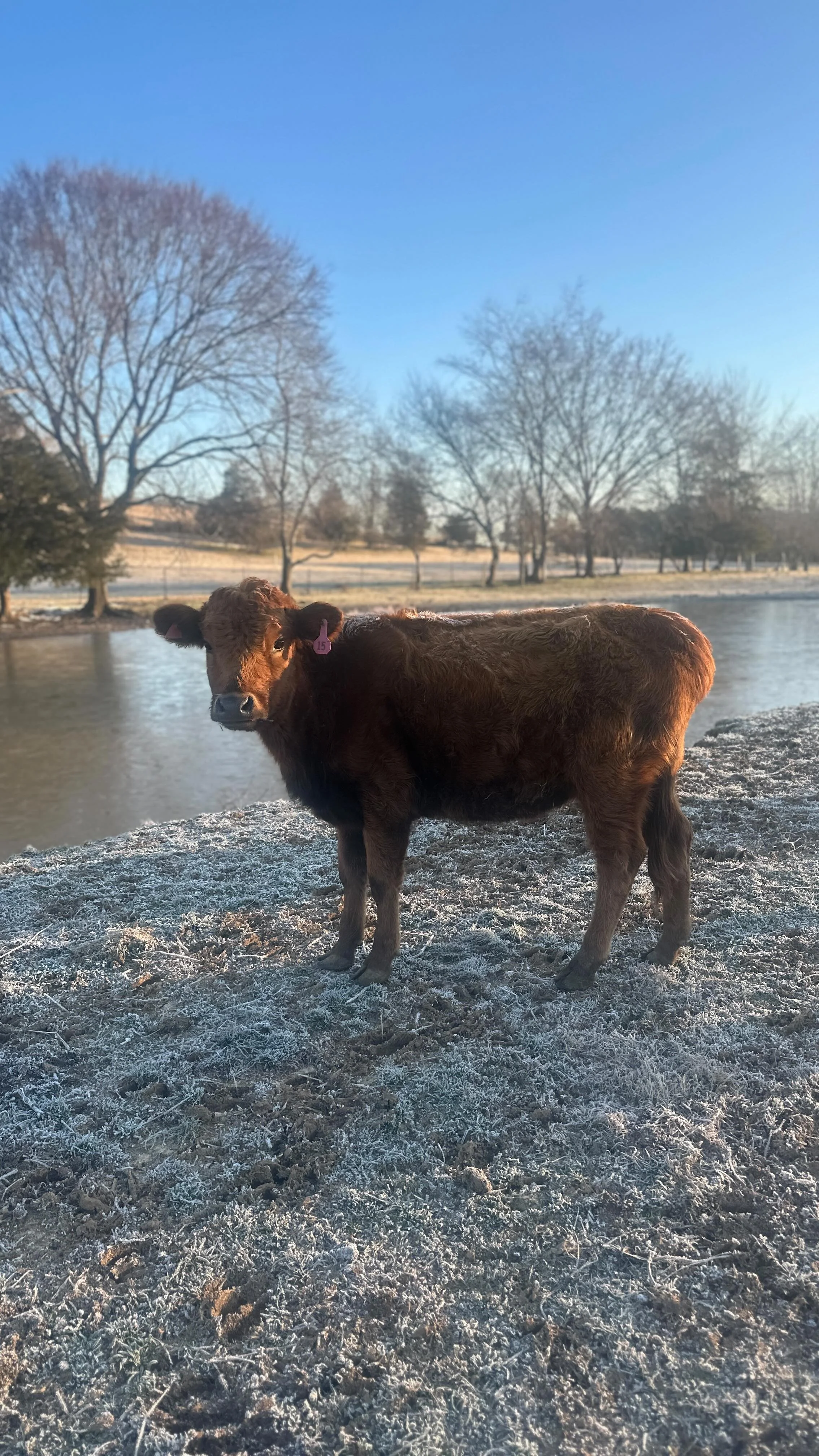 Horned, long leg, red bull calf, A2N (tested), may carry dun, genotyped, ADCA registered, non-carrier PHA, Date of Birth 3/23/2021